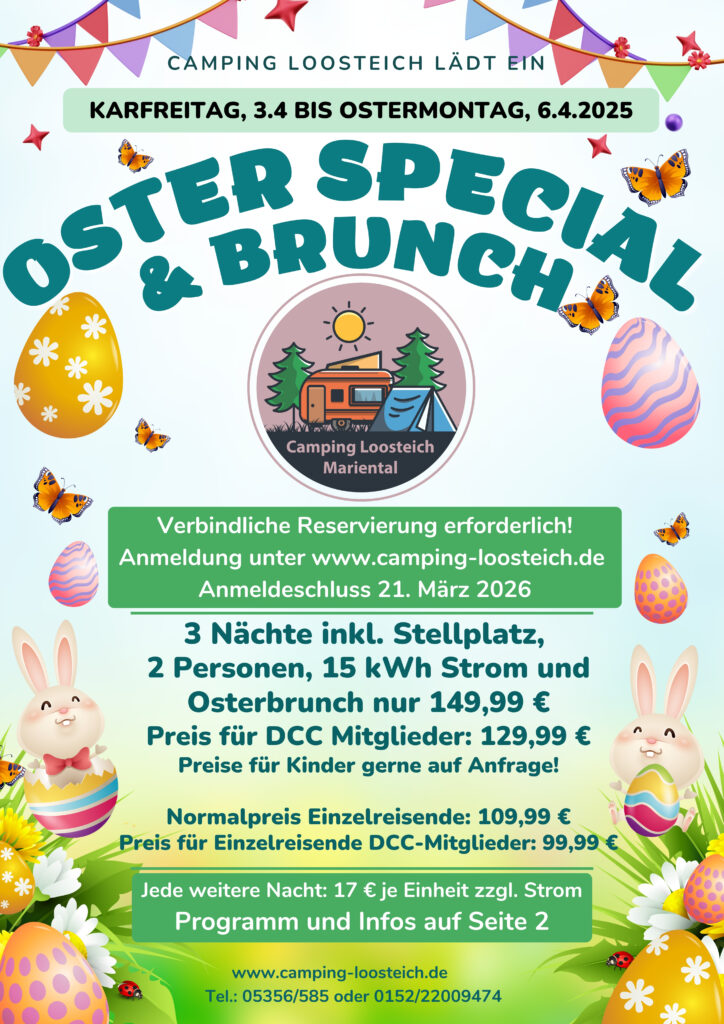 Von Karfreitag, den 3. April 2026 bis Ostermontag, den 6. April 2025 bietet der Camping Loosteich wieder ein Osterspecial an.